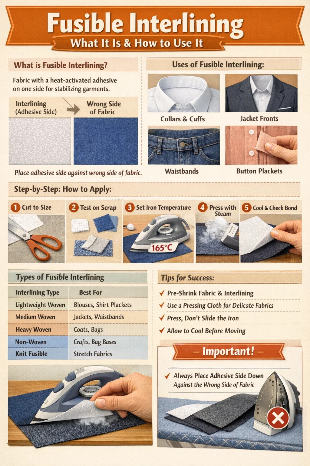 | Fusible tejido medio | Frentes de chaqueta, cinturillas | Lana, algodón de peso medio | 160–170°C |