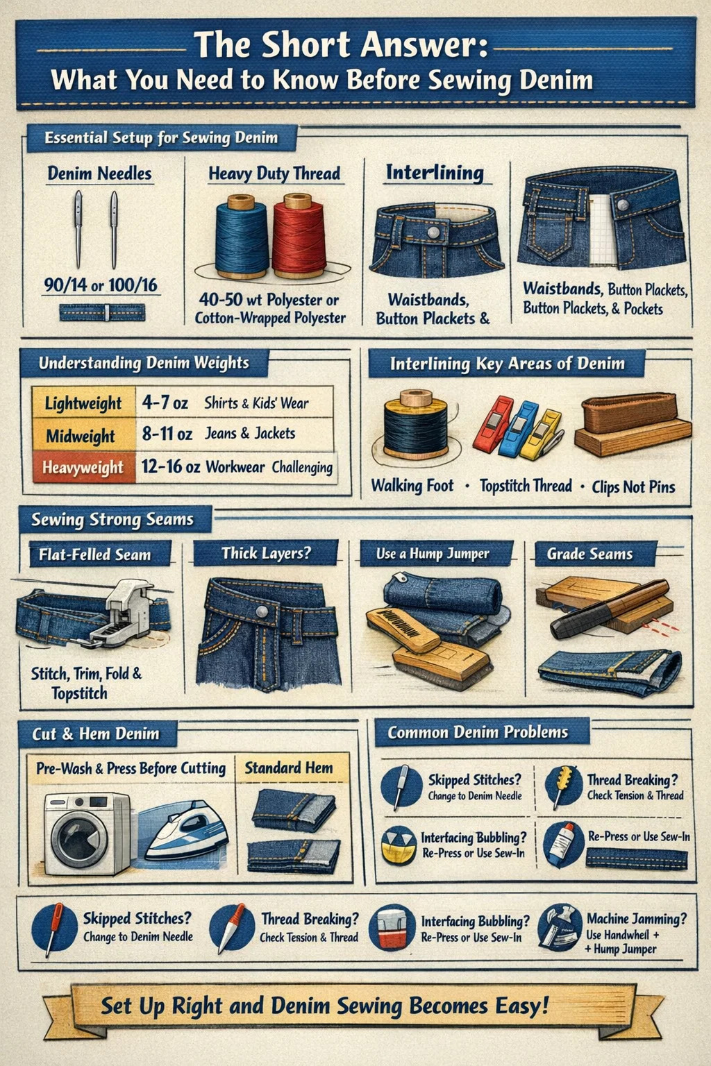 Saltarse la fase de configuración es la principal razón por la que los proyectos de mezclilla salen mal. Esto es exactamente lo que su máquina y su kit de herramientas necesitan antes de la primera puntada.