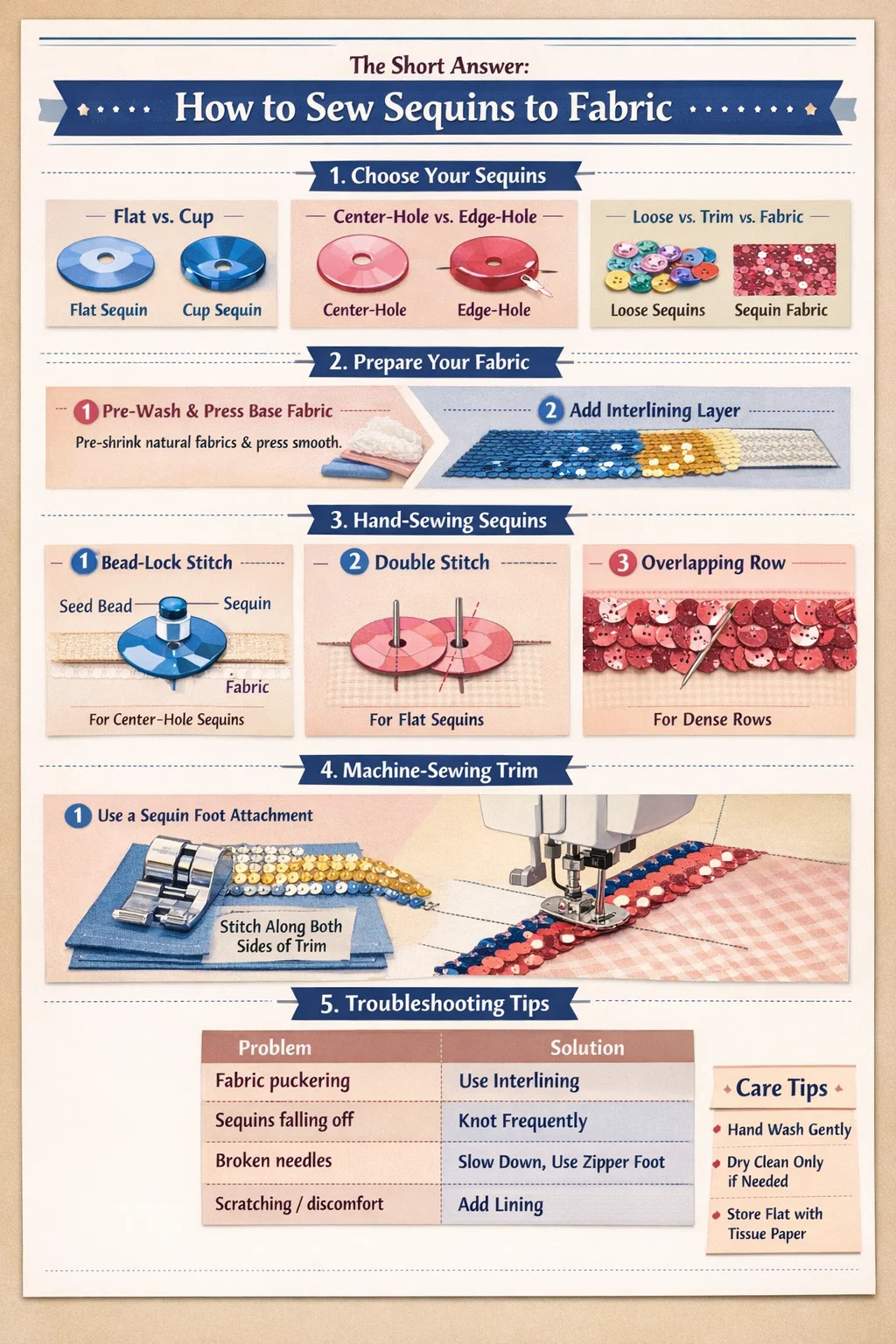 Esta guía recorre cada etapa: elegir las lentejuelas adecuadas, preparar la tela y el entretela, coser a mano piezas individuales, aplicar adornos de lentejuelas a máquina, solucionar problemas comunes y cuidar su proyecto terminado. Se incluyen números de puntadas, tipos de hilos y pesos de entretela específicos para que pueda obtener resultados que parezcan profesionales en lugar de caseros.