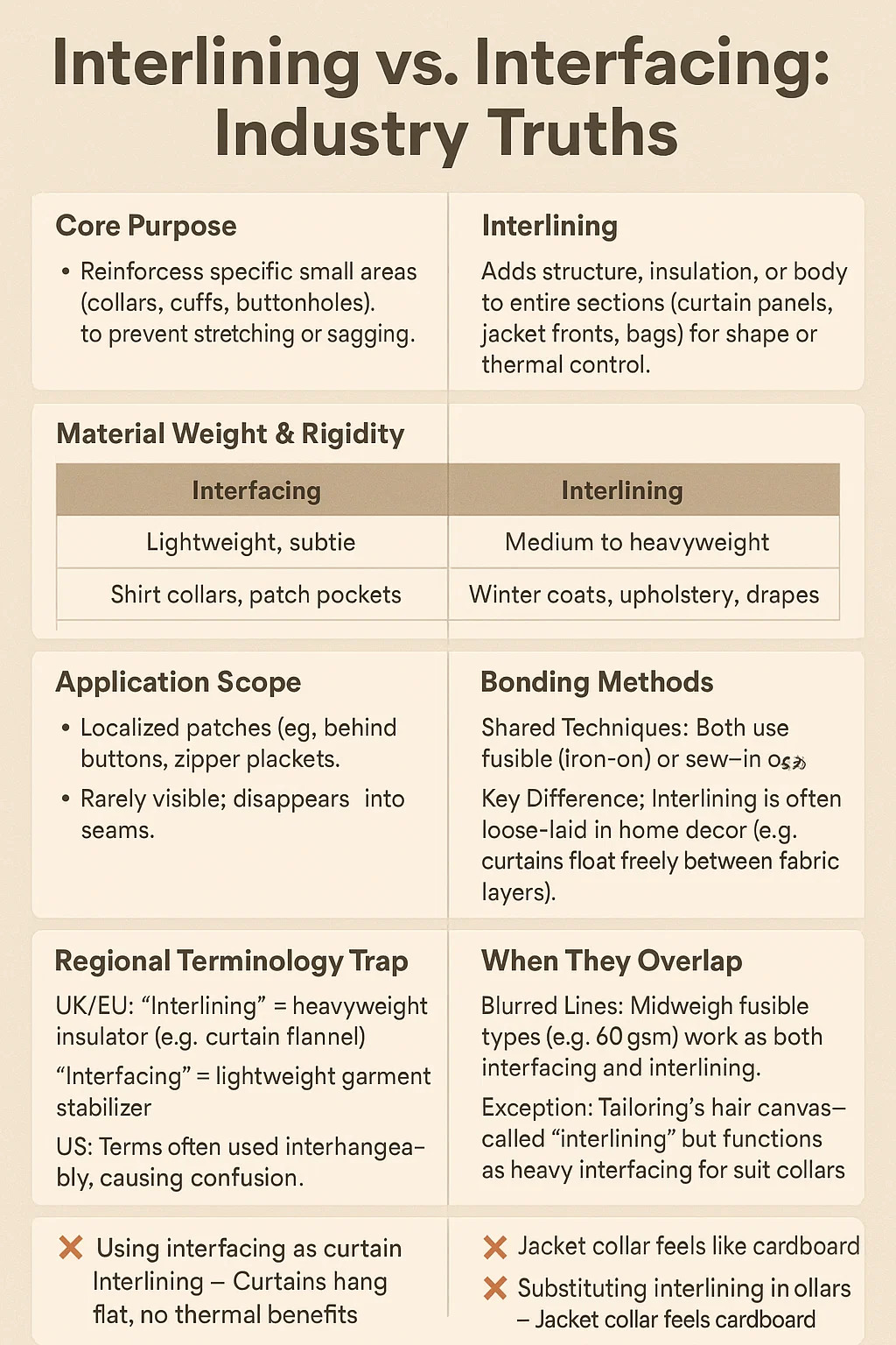 Usar entretela como entretela de cortinas → Las cortinas cuelgan planas, sin beneficios térmicos.