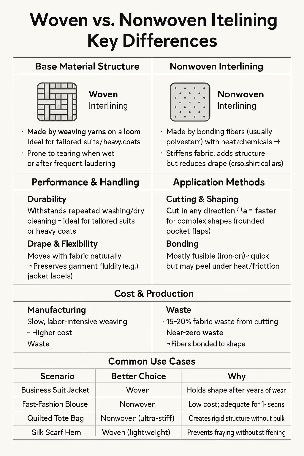 Interlining tejido : Hecho al tejer hilos (algodón, poliéster o mezclas) en un telar → tiene líneas de grano distintas (urdimbre/trama).