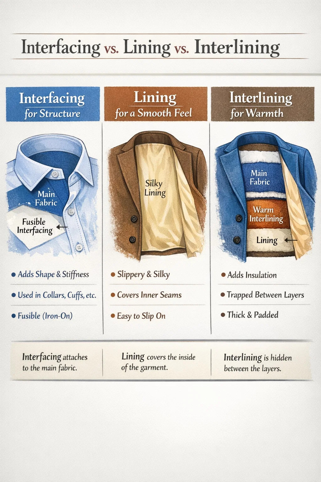En la confección de prendas de vestir, entretelas, forros y interlineado Son como tres héroes anónimos que trabajan detrás de escena. Cada uno desempeña un papel distinto a la hora de transformar un tejido flojo en una prenda terminada estructurada, cálida y cómoda.